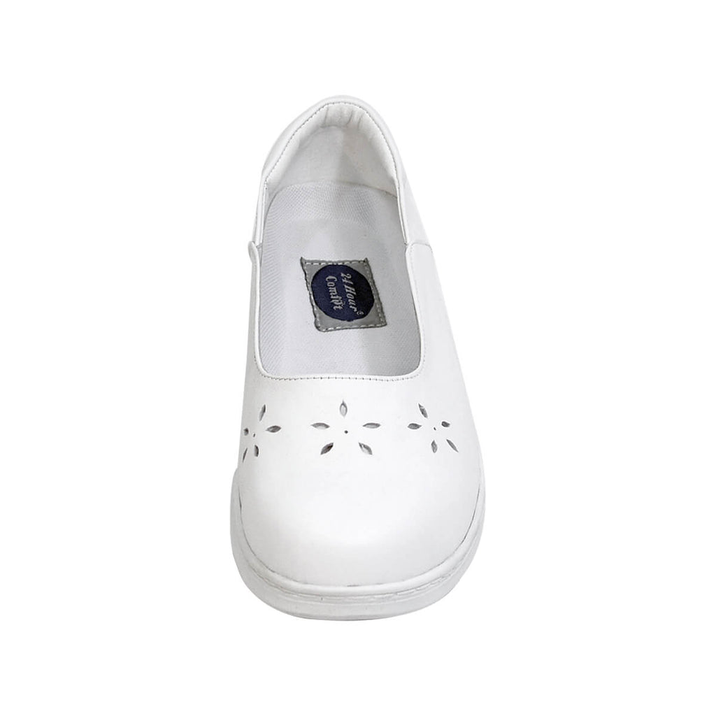 24 HOUR COMFORT Ariel women's wide width slip-on shoes come with a floral cut designed upper. A lightweight and durable comfort shoe with rubber outsole which provides maximum traction, and a leather upper to enhance breathability which doesn't bother your feet throughout a continuous working day.
