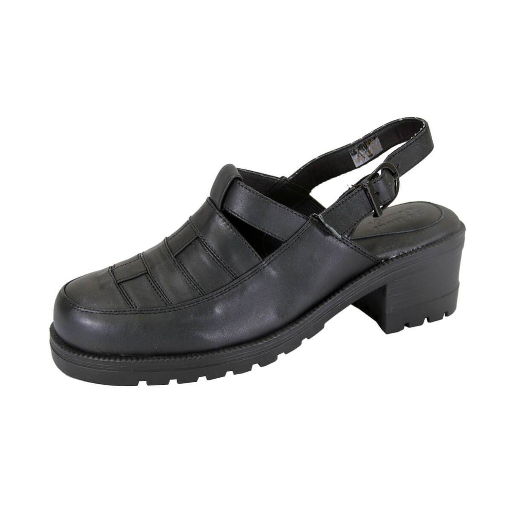 24 HOUR COMFORT Cora women's wide width slingback clogs with an adjustable buckle. This ladies' durable and lightweight shoe features a rubber outsole for maximum traction and a 2" block heel. It is comfortable, both for professional or casual wear with a leather upper, a back of heel cushion for ultimate comfort, and around-the-clock support and stability.