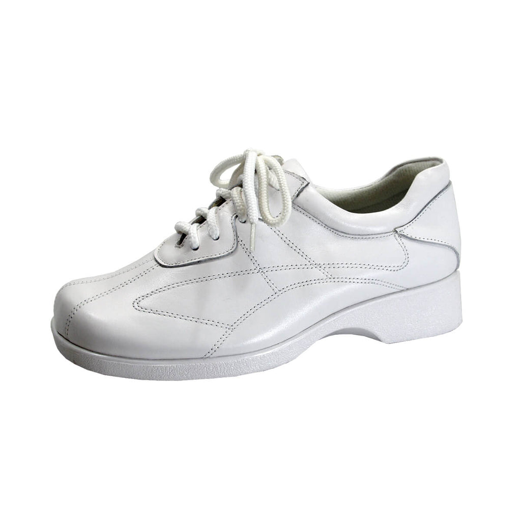 24 HOUR COMFORT Lisa women's extra wide width shoe for a relaxed fit. This ladies' shoe features a 1" low heel, lace-up tie closure for all-day comfort while you're on the go, and it is made with a durable rubber materials outsole for maximum surface grip with a leather upper for continuous breathability.