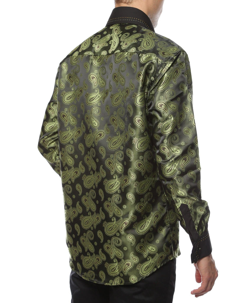 Elevate your style with our Men's Hi-1010 Dress Shirt in Green Paisley. This shirt features an impressive Paisley design and a traditional single chest pocket. The premium quality fabric, high collar, and classic regular fit will make you stand out at any occasion. French cuffs add a touch of elegance to complete the look. Crafted from 100% satin microfiber, this shirt is a must-have for any fashion-forward man. Dry clean only for long-lasting wear.