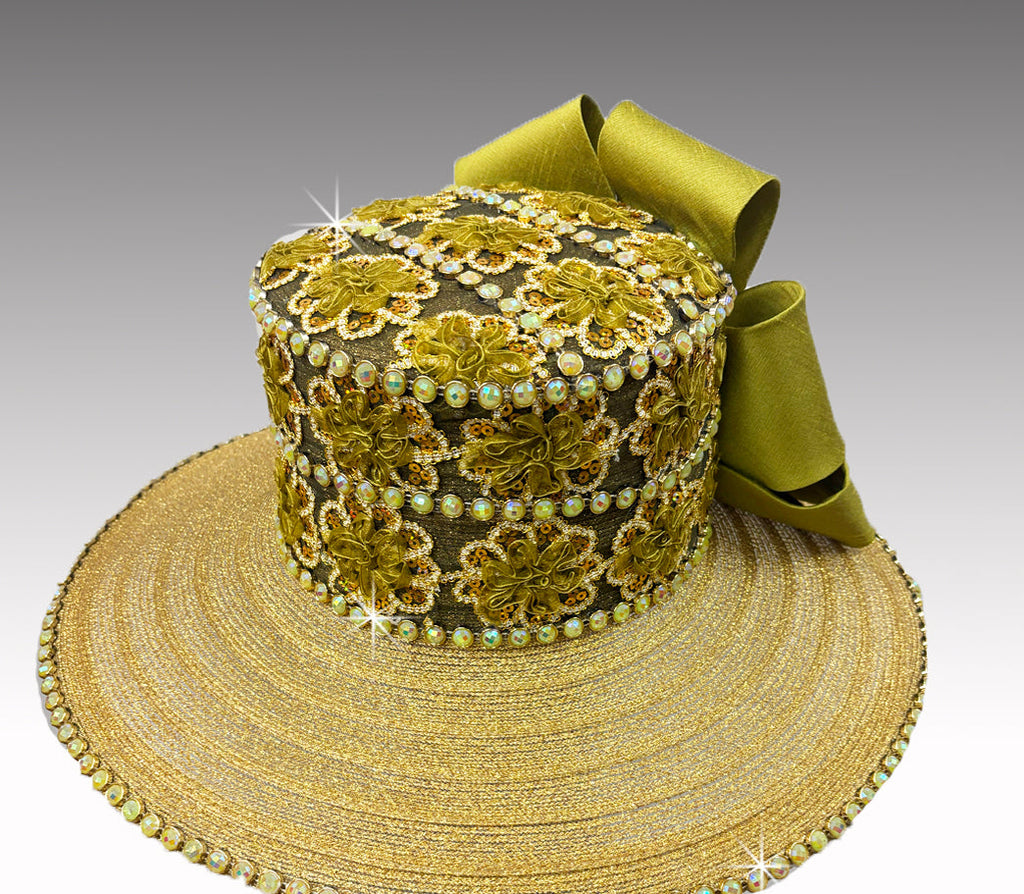 The Women Church Hat 3417 Citrine features a dramatic, jewel-studded profile bow that adds a bold, glamorous touch, perfect for formal occasions like church services, weddings, and the Kentucky Derby. With a 4.5-inch brim and crown, this hat showcases delicate citrine-colored embroidery and tonal sequins. A sculpted four-prong bow above the right eye is centered with a sparkling crystal flower, creating a refined and dimensional statement piece that elevates any special event ensemble.