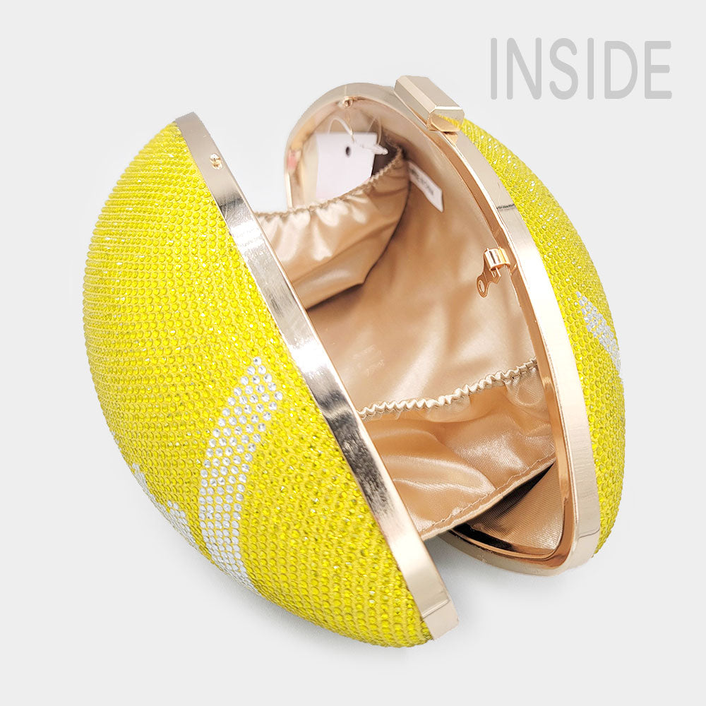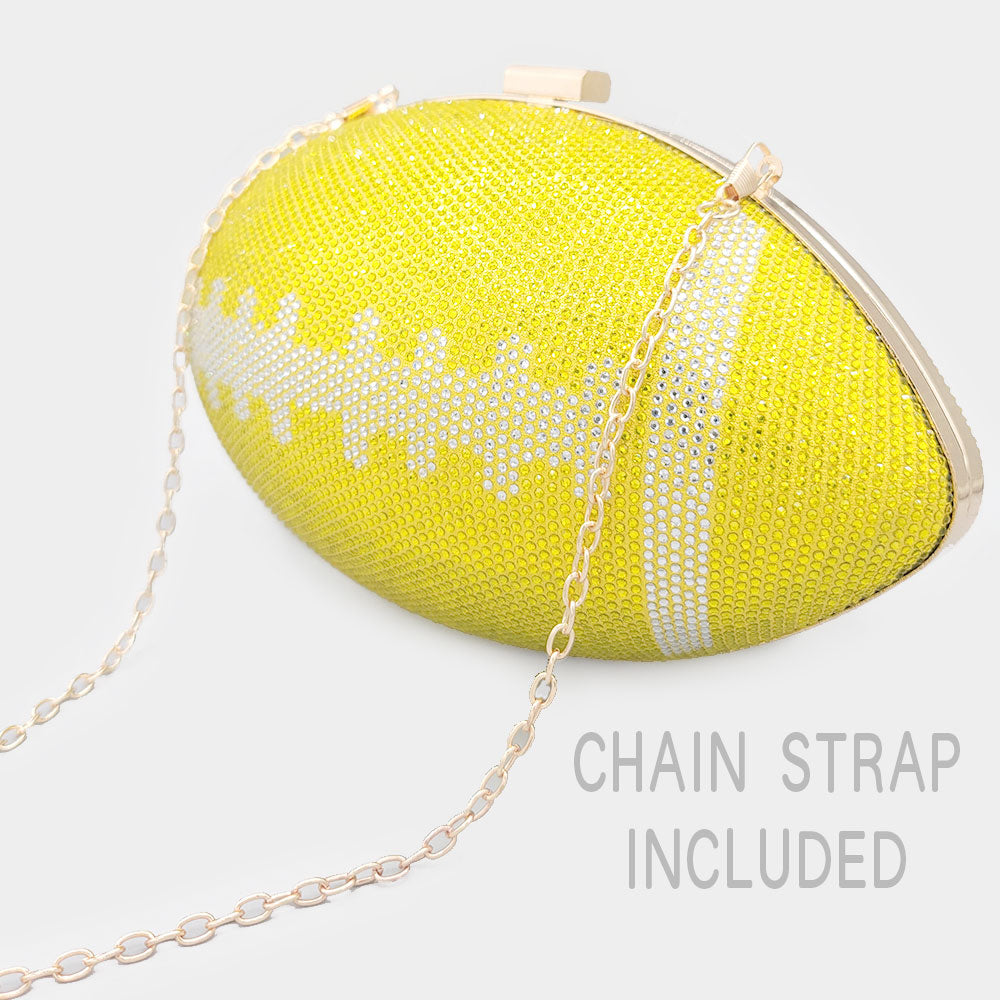 Rhinestone Football Evening Clutch / Crossbody Bag Details • Dimensions: 10" x 5.5" • Detachable Chain Strap: 24" L • No Internal Slip Pocket • Secured with Clasp Closure • Make a bold statement with this football-shaped clutch, adorned with rhinestones for a glamorous touch. Its compact design is ideal for stadium outings, tailgates, or sports-themed celebrations, combining fun and fashion effortlessly.
