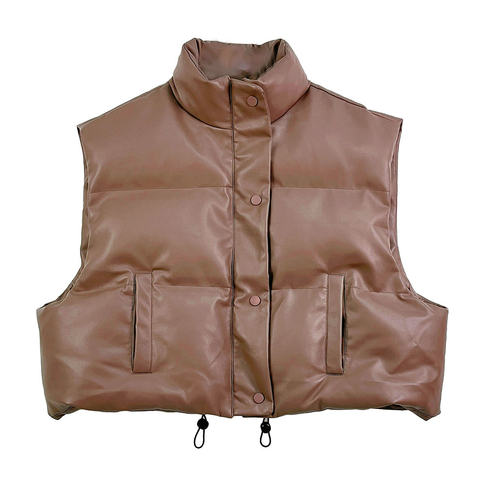 The Women Faux Leather Padded Vest is designed for style and versatility, crafted from 100% polyurethane with a polyester lining for durability and comfort. Its cropped length and boxy silhouette paired with a high collar offer a distinct streetwear edge. Featuring a snap-button front, this vest is an ideal layering piece that provides lightweight warmth and a bold look, perfect for navigating transitional weather with ease. Sized at 18.9" by 26.4", it balances fashion-forward design with practical wearability.