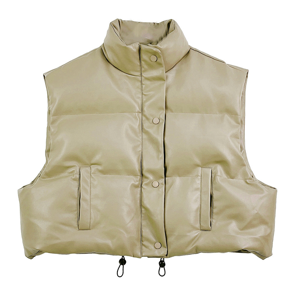 The Women Faux Leather Padded Vest is designed for style and versatility, crafted from 100% polyurethane with a polyester lining for durability and comfort. Its cropped length and boxy silhouette paired with a high collar offer a distinct streetwear edge. Featuring a snap-button front, this vest is an ideal layering piece that provides lightweight warmth and a bold look, perfect for navigating transitional weather with ease. Sized at 18.9" by 26.4", it balances fashion-forward design with practical wearability.